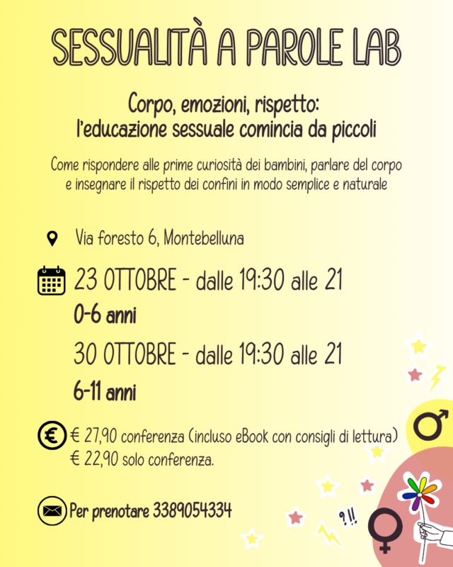 Per accompagnare le famiglie in questo percorso nasce Sessualità a Parole LAB, un ciclo di due incontri in presenza a Montebelluna dedicati ai genitori di bambine e bambini da 0 a 11 anni.